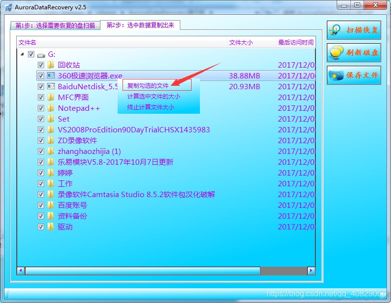 步骤4:将想要恢复的数据勾上,然后点右上角的保存,《文件保存》按钮,将勾上的文件拷贝出来。
