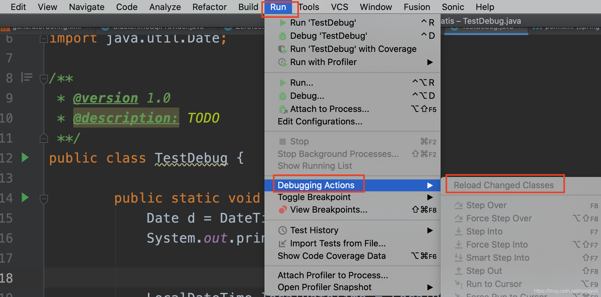 2、通过debug启动项目后,当修改了代码后,依次点击Run--》Debugging actions--》Reload Changed Classes,即可在不重启的情况下使代码生效,提升开发效率。