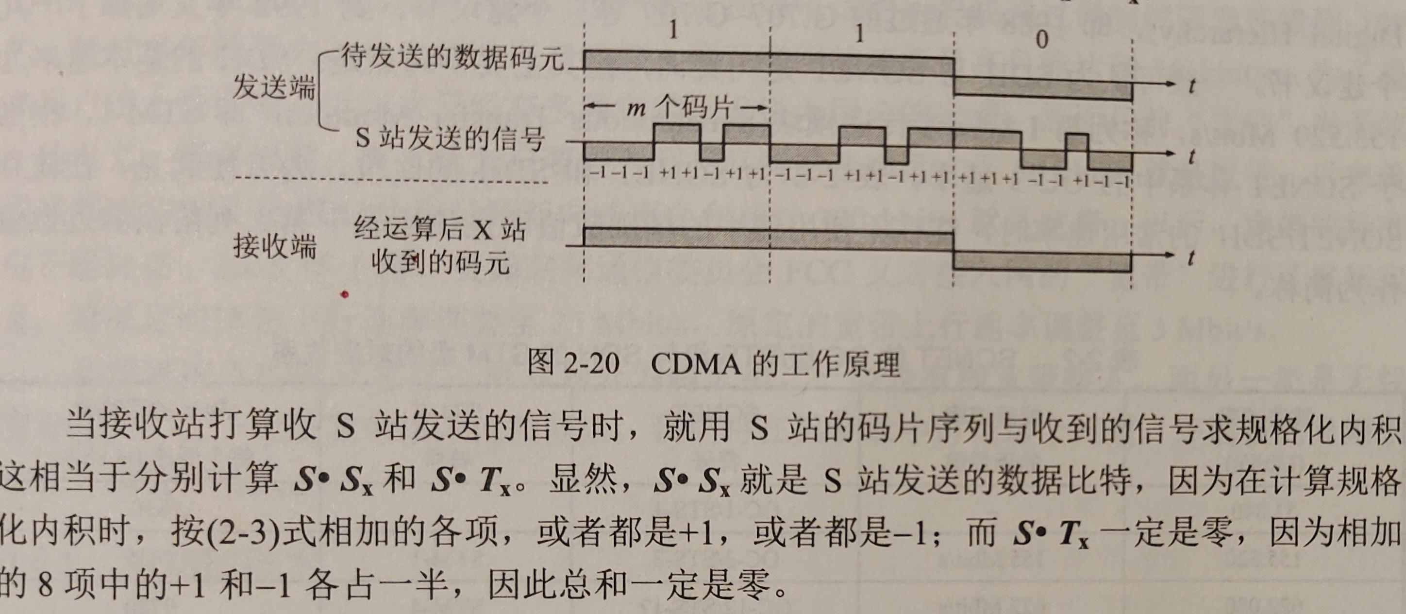 令向量 S 表示站 S 的码片量,再令 T 表示其他任何站的码片向量,则两个不同站的码片序列正交,就是向量 S 和 T 的规格化内积都是0: