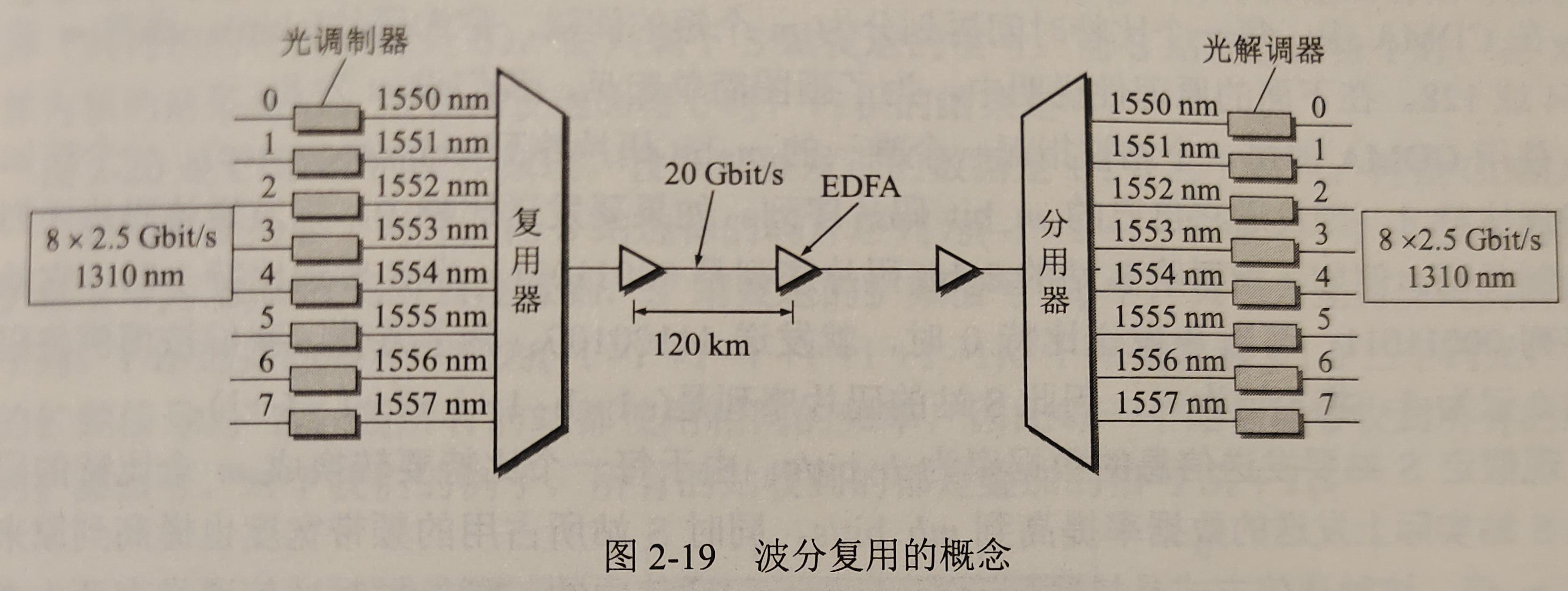 注:随着时代的发展,在一根光纤上复用的光载波信号的路数越来越多,现在可以做到一根光纤上复用几十路甚至更多的光载波信号,于是就出现了密集波分复用 DWDM这一名词。