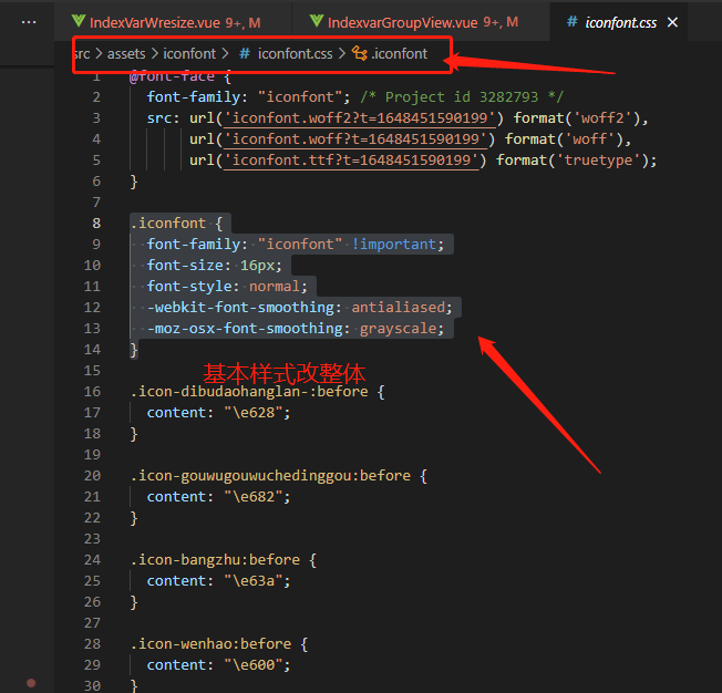 单独的某个vue文件生效在其中改<style scopd></style>中添加 .iconfont样式,可以直接从公共文 件css复制过来
