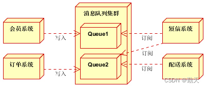 - 订单系统:用户下单后,订单系统完成持久化处理,将消息写入消息队列,返回用户订单下单成功。