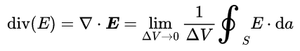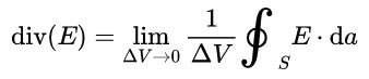 也就是说,电场E在一个点(被无穷小曲面围着的这个点)上的散度被定义为电场通过这个无穷小曲面的电通量除以体积。散度的英文单词是divergence,所以我们通常就用div(E)表示电场E的散度,即: