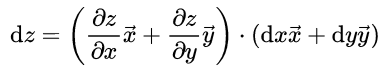 这个公式我们可以把它做作全微分定理,它其实是对上面一元函数导数关系的一个自然推广。它告诉我们,虽然在曲面的一个点上有无数个方向,但是只要我们掌握了其中x和y两个方向上的偏导数,我们就能把握它的函数变化dz。还原到爬山的这个例子上来,这个公式是在告诉我们:如果我知道你沿着x轴和y轴分别走了多少,然后我知道你这座山在x轴和y轴方向的倾斜度(即偏导数)是多少,那我就知道你爬山的纯高度变化有多少(又是几近大废话~)。我们费了这么多劲就为了推出这个公式,那么这个公式里肯定隐藏了什么重要的东西。不过,现在这种形式还不容易看清楚,我们还得稍微了解一点矢量分析的内容,把公式拆成矢量点乘的形式,那就明显了。