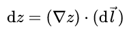 这个梯度我们要怎么去看呢?首先▽z是一个矢量,是矢量就既有大小又有方向,我们先来看看梯度的方向。上面我们已经得到了dz=▽z·dl,把dz表示成了两个矢量的点乘,那我们再根据矢量点乘的定义把它们展开,就可以写成这样: