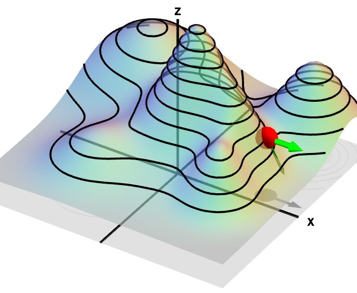 比如山的高度,一座山在不同点的高度是不一样的,而在地面上确定一个点的位置需要经度和纬度两个信息。或者,你可以自己在地面上建立一个坐标系,然后地面上每一个点都可以用(x,y)来表示。因为每一个位置(x,y)都对应了那个地方山的高度z,那么z就成了一个关于x和y的函数,记做z=f(x,y)。因为山的高度z需要两个变量x和y才能确定,所以我们说z=f(x,y)是一个二元函数。再例如,我房间的每一个点都有一个温度,所以房间的温度T是一个关于房间内空间点的函数,而房间里每一个点的位置需要长宽高三个变量(x,y,z)才能确定。所以,我房间里的温度T是一个关于x,y,z的三元函数,记做T=f(x,y,z)。我们再来回过头来看看导数,在一元函数y=f(t)里,我们用dy/dt来表示这个函数的导数,导数越大的地方曲线变化得越快。因为一元函数的图像是一条曲线,曲线上的一个点只有一个方向(要么往前,要么往后,反正都是沿着x轴方向),所以我们可以直接用dy/dt表示函数变化得有多快。但是,如果这个函数不是一元函数,而是二元、三元等多元函数呢?