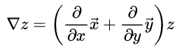 这个东西就值得我们玩味了,这是啥?▽z表示的是二元函数z=f(x,y)的梯度,也就是说我们先有一个函数z,然后我们把这个▽往函数z前面一放,我们就得到z的梯度。从函数z得到z的梯度的具体过程就是对这个函数z分别求x的偏导和y的偏导。