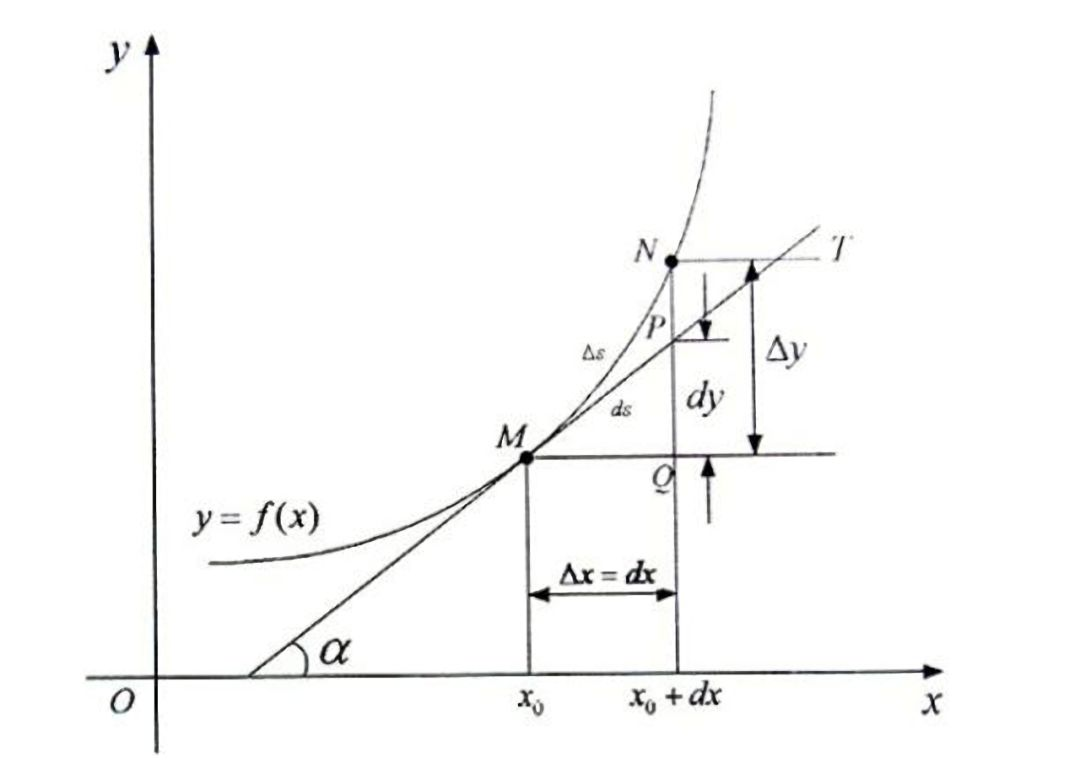 从这个图里我们可以看到:Δy的值是要比dy大一点点的,但是随着Δx或者dx的减小,它们的之间的差值会急速减小,比Δx减小的快得多,这个差值也是我们常说的高阶无穷小。Δy叫做函数从一点到另一点的增量,而dy则被叫做函数的微分,或者叫它的线性主部。“以直(dy)代曲(Δy)”是现代微积分的一个核心思想,从这个图里可见一斑。在微积分刚创立的时候,莱布尼茨把dx看作一个接近0但又不等于0的无穷小量,这种“朴素”的思维很符合直觉,而且用这种思想来计算也没什么错,但是它的基础是非常不牢固的。正是这种幽灵般的无穷小量dx(时而可以看作是0,时而可以当除数约分)导致了第二次数学危机,数学家们经过一个多世纪的抢救才给微积分找到了一个坚实的地基:极限理论。