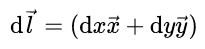于是,dz就被我们拆成了两个矢量点乘的样子,我们再来仔细看看这两个矢量:右边的这个矢量的两个分量分别是dx和dy,这分别是我沿着x轴和y轴分别移动无穷小的距离,它们相加的结果用dl来表示: