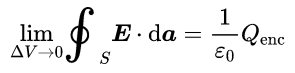 Lim就是英文单词极限(limit)的缩写,ΔV通过一个箭头指向0可以很形象的表示它无限趋近于0。有了这个极限的概念,我们就可以很自然的表示通过这个无穷小曲面的电通量了(直接在电通量的前面加个极限符号),这时候高斯电场定律就成了这样: