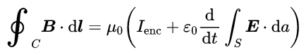 讲完了磁生电的法拉第定律,我们麦克斯韦方程组就只剩最后一个电生磁的安培-麦克斯韦定律了。它描述的是电流和变化的电场如何产生旋涡状的感生磁场的,因为它电的来源有电流和变化的电场两项,所以它的形式也是最复杂的。方程的积分形式如下(具体过程见积分篇):
