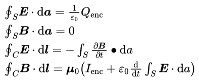 至此,麦克斯韦方程组的四个方程:描述静电的高斯电场定律、描述静磁的高斯磁场定律、描述磁生电的法拉第定律和描述电生磁的安培-麦克斯韦定律的微分形式就都说完了。把它们都写下来就是这样: