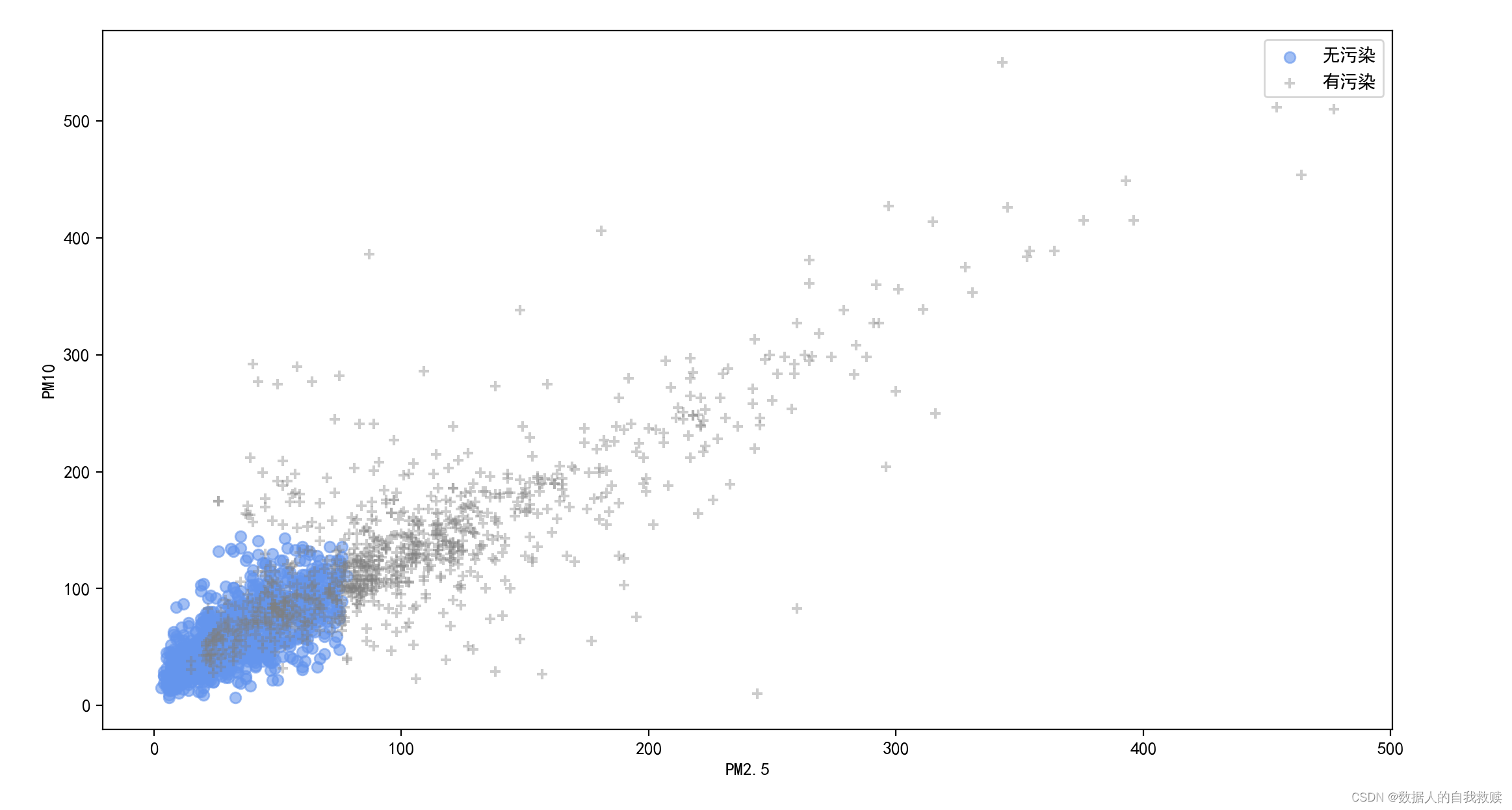 ax.scatter(data.loc[flag,'PM2.5'],data.loc[flag,'PM10'],c='cornflowerblue',marker='o',label='无污染',alpha=0.6)