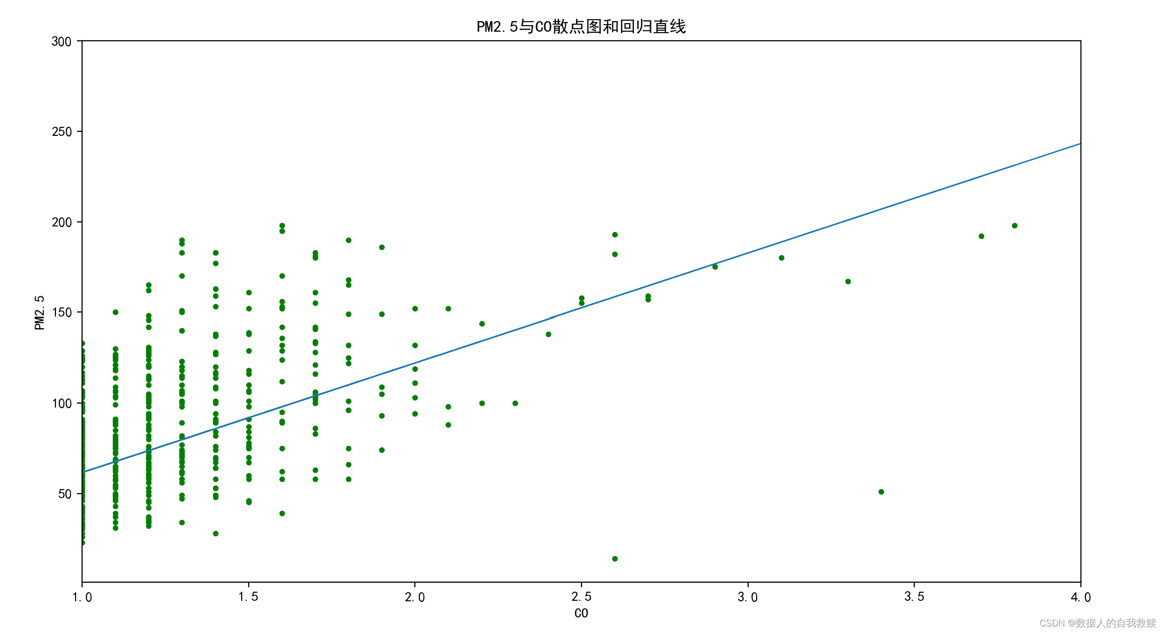 ###在研究CO对PM2.5的影响时,CO的回归系数估计值(60.59)大于0,表示其他因素不变的条件下,CO浓度增加一个单位将导致PM2.5均值增加60.59