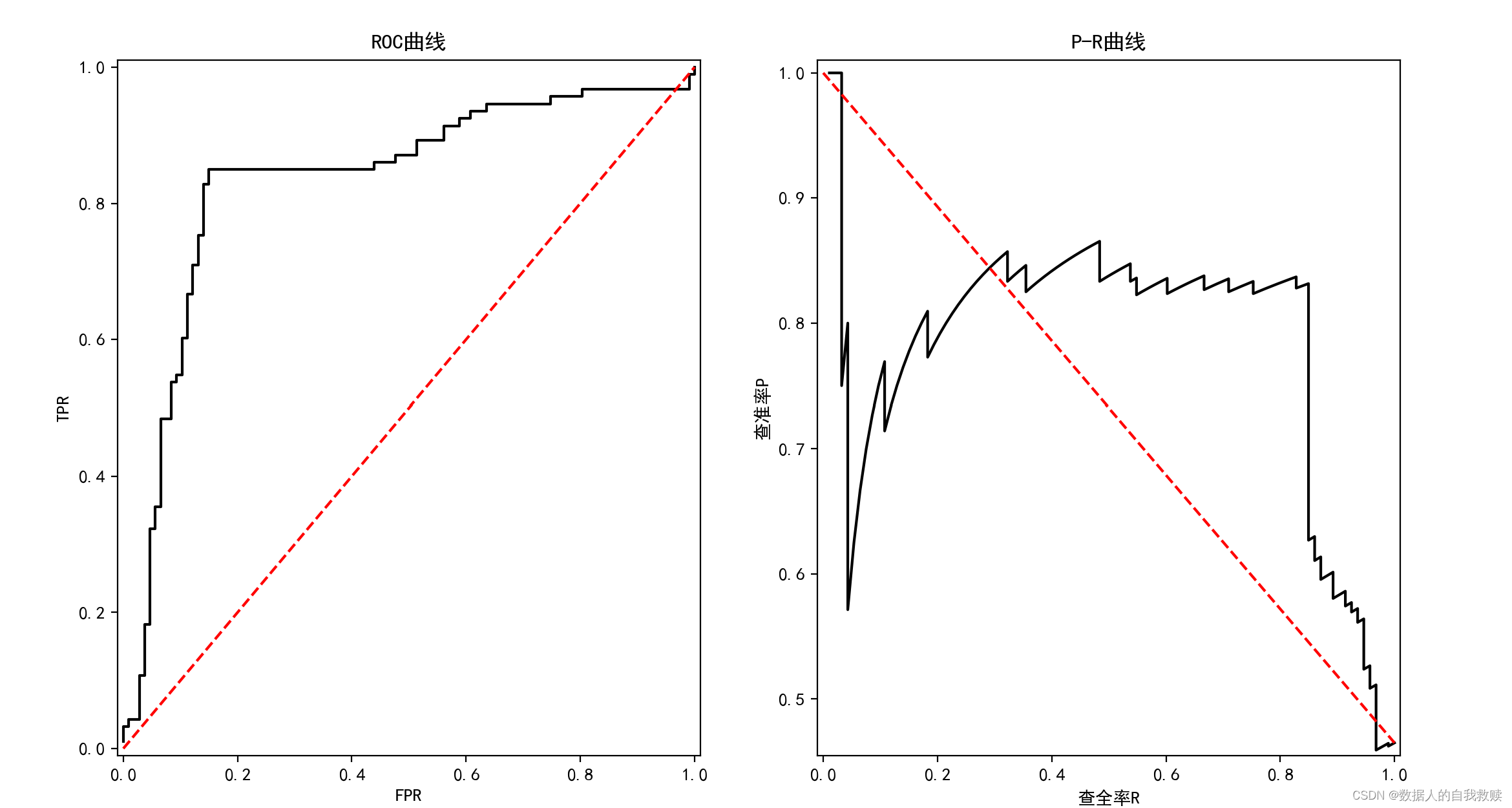 #这里给出绘制ROC曲线和P-R曲线的示例。数据来自名为“类别和概率.csv”的文本文件,包括两列数据。