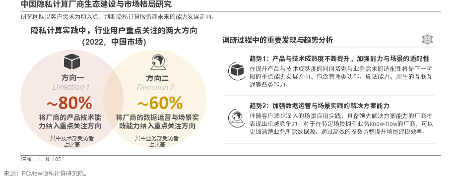 报告中,PCview隐私计算研究院分别对行业发展现状与趋势、细分领域实践、典型厂商展开了深入的研究。研究团队站在行业用户需求与应用实践的视角,进行了大量精细化的市场调研。