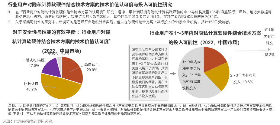 目前各领域的用户对软件、硬件、软硬件结合技术方案的接受度不一。例如:金融领域的技术采购主要以软件方案为主,仅少数机构的采购中包含了TEE或一体机。相比于金融,政务领域的项目采购中,对硬件的接受程度要更高,但是软件类项目在政务领域的采购中依然占主流。从技术理论上来看,软硬件结合技术方案可以更加有效地平衡安全性与性能,但因目前处于隐私计算商用实践的初期,软硬件结合技术方案的商业化空间暂未完全打开,未来具备较大市场发展机会。对此,我们面向行业用户对软硬件结合技术方案的技术价值认可度以及未来1~3年的投入可能性展开了如下调研。
