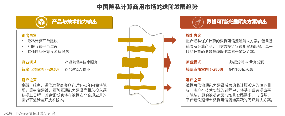 隐私计算的商用实践将由产品与技术能力输出走向数据可信流通解决方案输出,进而撬动千亿数据可信流通市场空间
