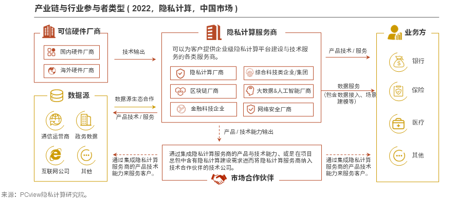 中国隐私计算行业迎来“群雄逐鹿”的时代,市场参与者类型包含了数据源、业务方、隐私计算服务商及其上下游伙伴,隐私计算服务商的类型也呈现出多元化的特点。