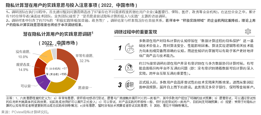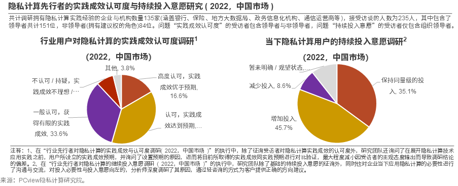 研究团队以面向行业用户的市场调研为基础,根据行业用户的技术投入意愿与实践规划而展开预测:未来3~5年,将有70%~80%的中国大型企业与机构将会为数据安全合规展开战略规划或者进行相应咨询与技术采购服务,而在技术采购服务中,既包括单独的隐私计算平台建设采购,也包括了融入隐私计算的商业分析与数据智能等类型的产品。