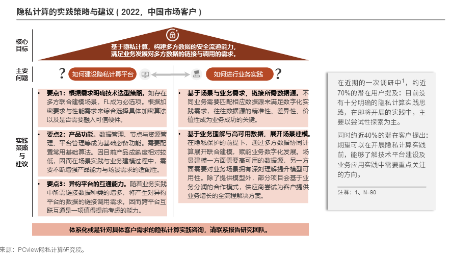 基于报告上文对隐私计算的不同技术路线、产品成熟度、要点技术能力解析,以及对行业用户的调研,我们站在客户视角建立了对隐私计算的技术认知与需求洞察。行业客户在将隐私计算纳入关键技术战略并展开投入时,需要拥有整体实践框架、明确值得关注的要点能力建设,并在技术平台建设基础上,了解如何展开业务实践,进而有针对性地选择供应商。