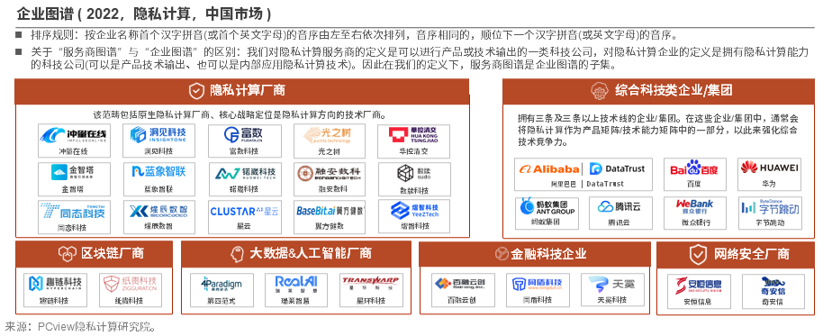 中国市场的隐私计算服务商主要包含了隐私计算厂商、综合科技类企业/集团、区块链厂商、大数据&人工智能厂商、金融科技企业。