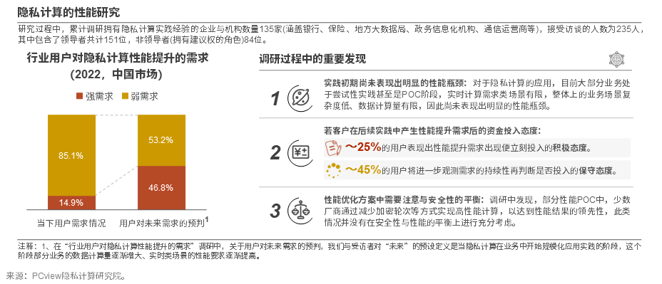 近期我们针对拥有隐私计算实践经验的客户展开了关于厂商产品成熟度的调研1,近65%的企业机构用户提出:厂商所提供的隐私计算产品具备基础的数据管理、平台管理、常见算法调用等功能,但落实在具体业务中,产品仍需要加强与业务需求的适配性、增加或者调整相关功能。在功能层面之外,安全、性能等技术能力也需不断提升。客户的反馈中我们可以看出目前隐私计算的产品成熟度与技术能力存在较大的进步空间。