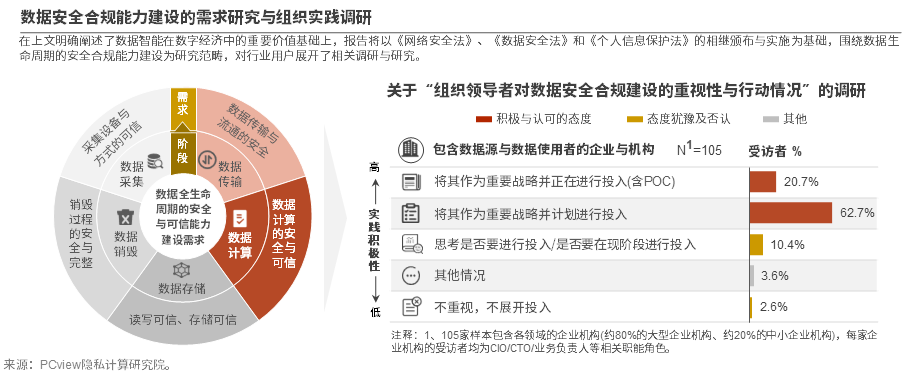 数据安全合规能力建设已经成为一项重要的战略技术趋势。从调研数据来看,市场目前仍处初期,较多企业虽然拥有较为积极的实践态度或者计划,但尚未开启正式实践,这也说明该市场拥有较大的发展空间。