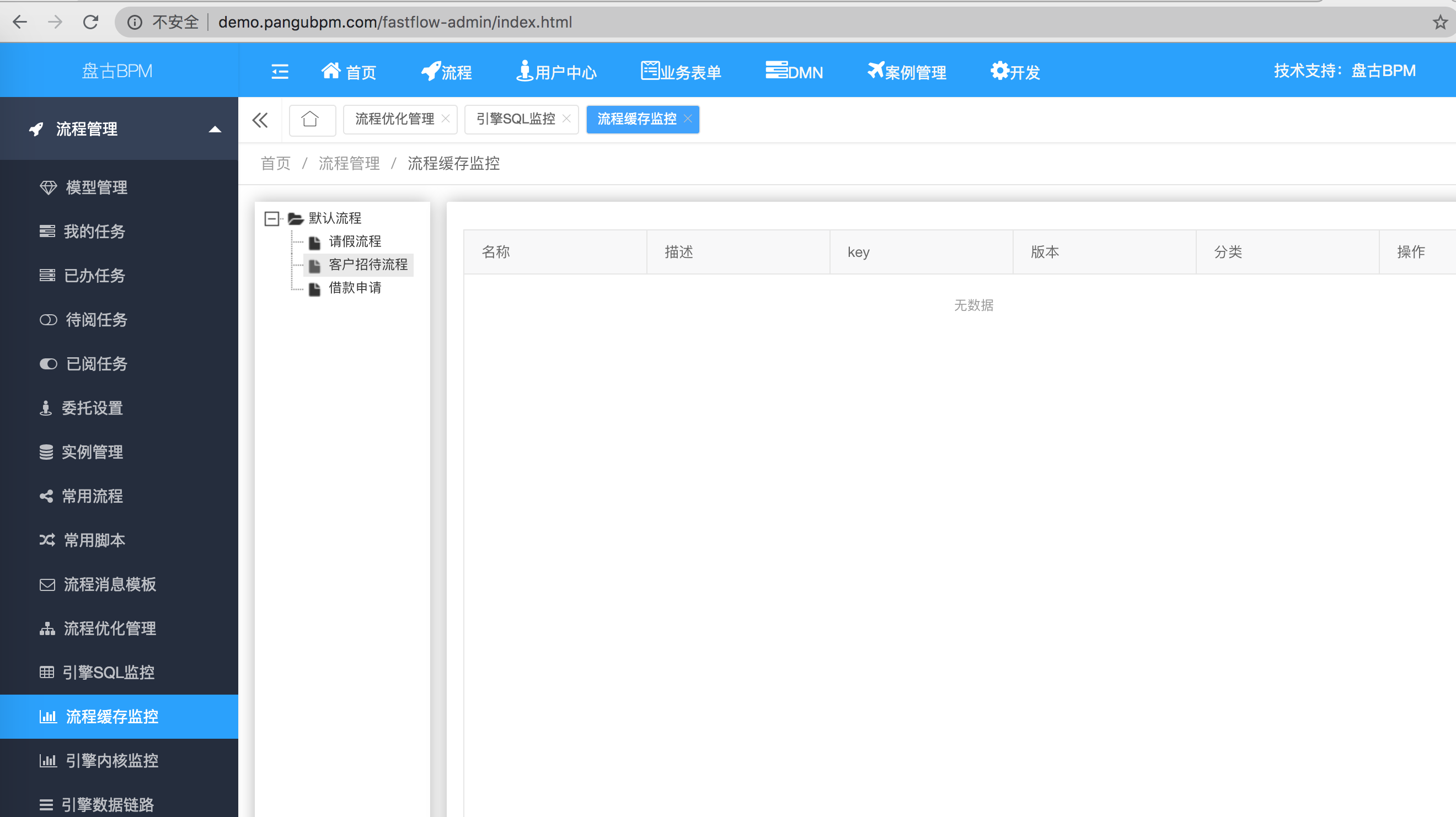因为xml解析的逻辑相对复杂,且比较耗时,如果能提前对一些常用的流程定义进行缓存预热,则模板缓存不会丢失,这样是最理想的情况。可以单独部署一套bpm进行流程定义的预热工作,盘古BPM的流程缓存监控如下所示: