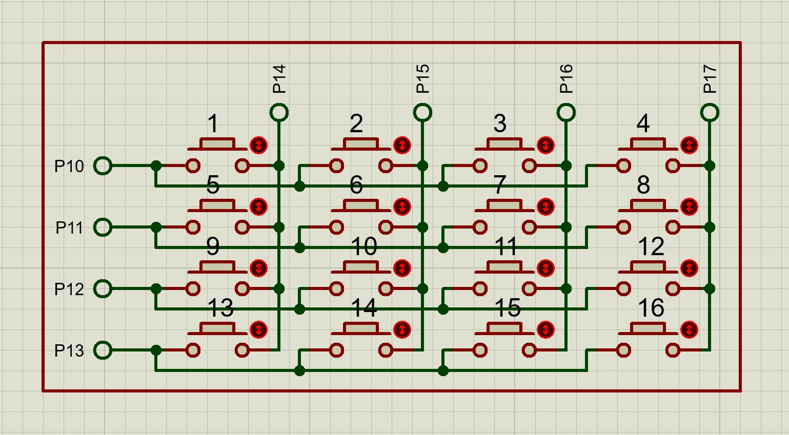 上图所示就是4X4矩阵键盘的常见接法,按行来看,每个按键的左端接在一起,按列来看,每个按键的右端接在一起,共占用8个I/O,接到51单片机的P1端口。