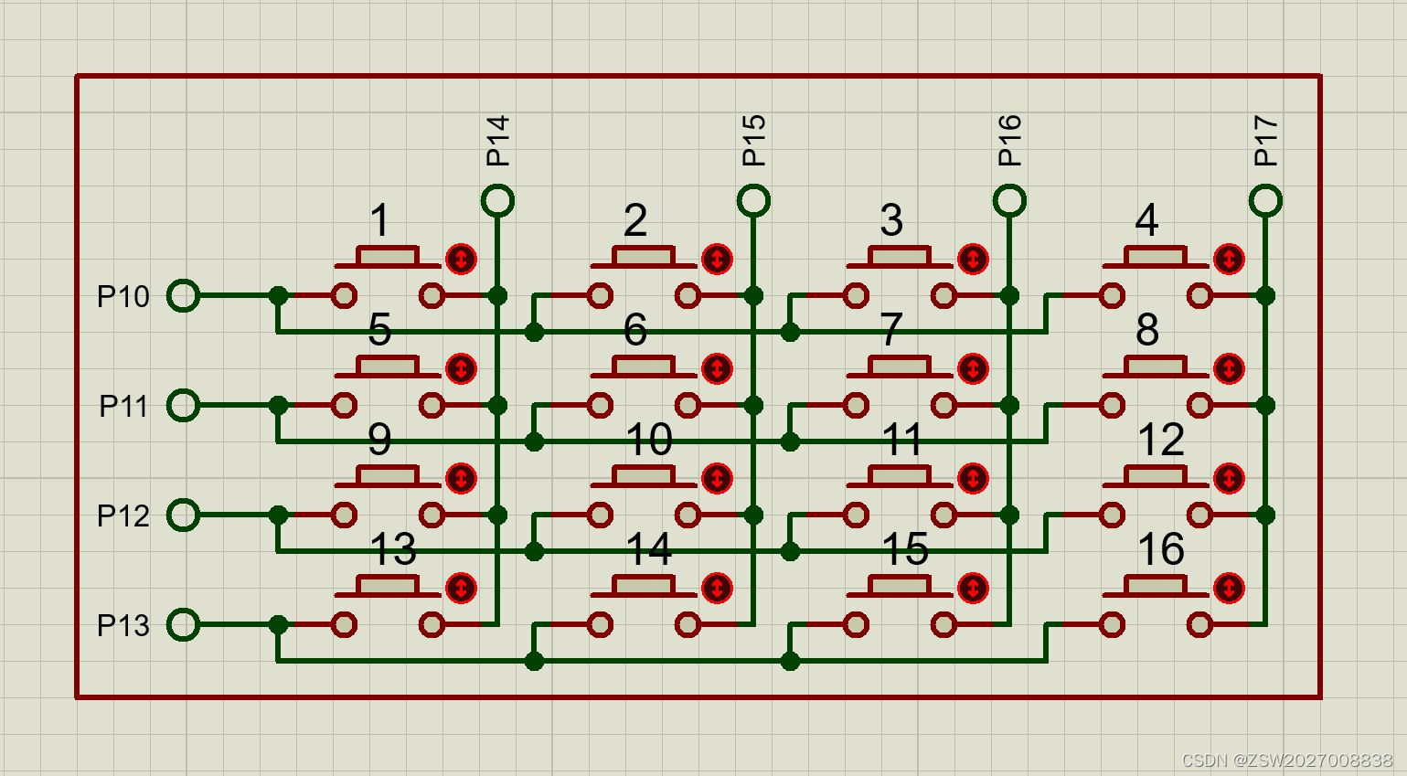 矩阵键盘使用的方法与独立按键类似,但是比独立按键节省I/O,同时使用方法变得相对复杂了,首先展示硬件连接。