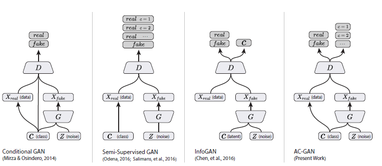 CGAN通过结合标签信息来提高生成数据的质量,SGAN通过重建标签信息来提高生成数据的质量,那么我们可不可以两者都用,答案是显然的,因为ACGAN就是这样干的。更加详细的内容可以参见论文:Conditional Image Synthesis with Auxiliary Classifier GANs