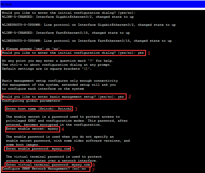 1.console连接后按回车,会提示是否进入交换机初始化对话框。