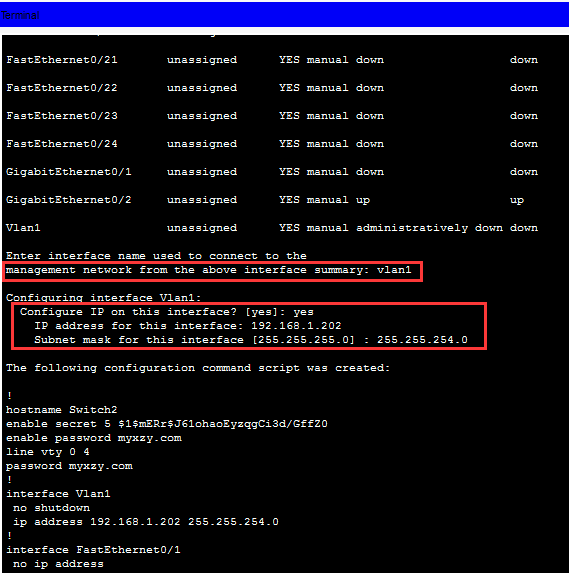 Swith2<config>#enable secret myxzy /*特权模式的密码设置为myxzy