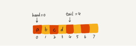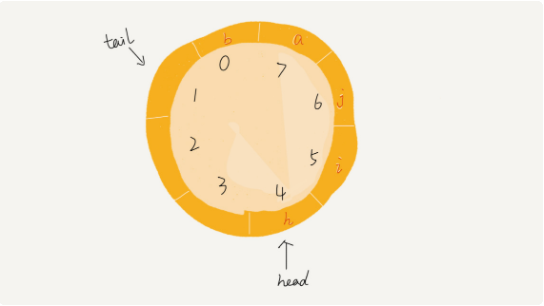 通过这样的方法,我们成功避免了数据搬移操作。看起来不难理解,但是循环队列的代码实现难度要比前面讲的非循环队列难多了。要像写出没有bug的循环队列的实现代码,最关键的时,确定好队空和队满的判定条件。