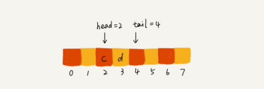 当我们调用两次出队操作之后,队列中的head指针指向下标为2的位置,tail指针仍然指向下标为4的位置。