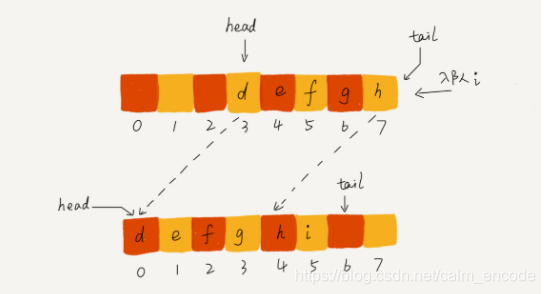 当队列的tail指针移动到数组的最右边后,如果有新的数据入队,我们可以将head到tail之间的数据,整体搬移到数组下标为0的位置。