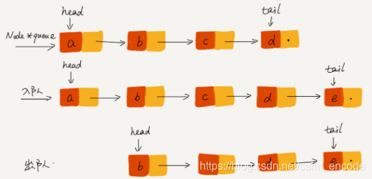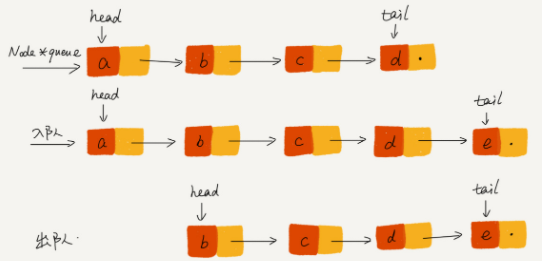 入队时:tail ->next = new node(增加结点), tail = tail->next(增加的结点为尾部结点);