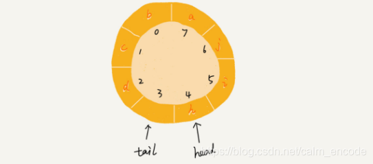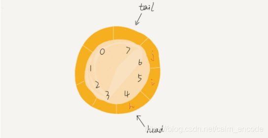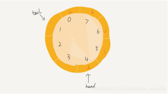 如图为队满的情况,tail = 3,head = 4,n = 8;有数据发现(3+1)%8=4。根据规律,队列满时,可以得到队满的公式为(tail +1)%n = head。