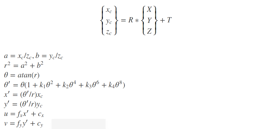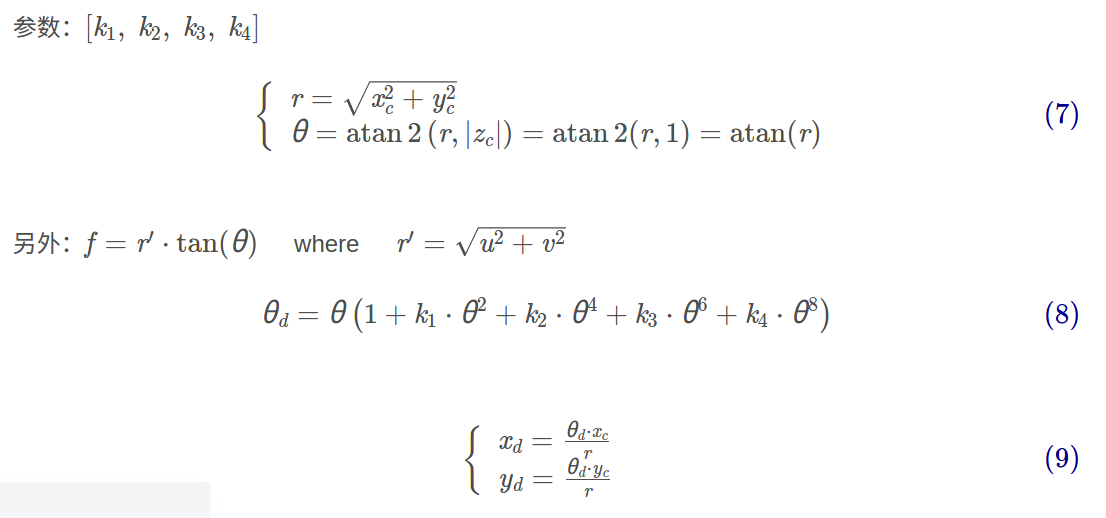 opencv中使用的鱼眼相机畸变模型就是这个模型,该模型适用于大多数鱼眼相机。另外,也可以用这种模型来对普通的针孔相机模型进行标定,仔细观察,上述的线性投影实际就是普通的针孔投影模型。最后鱼眼相机的投影模型可以表示为
