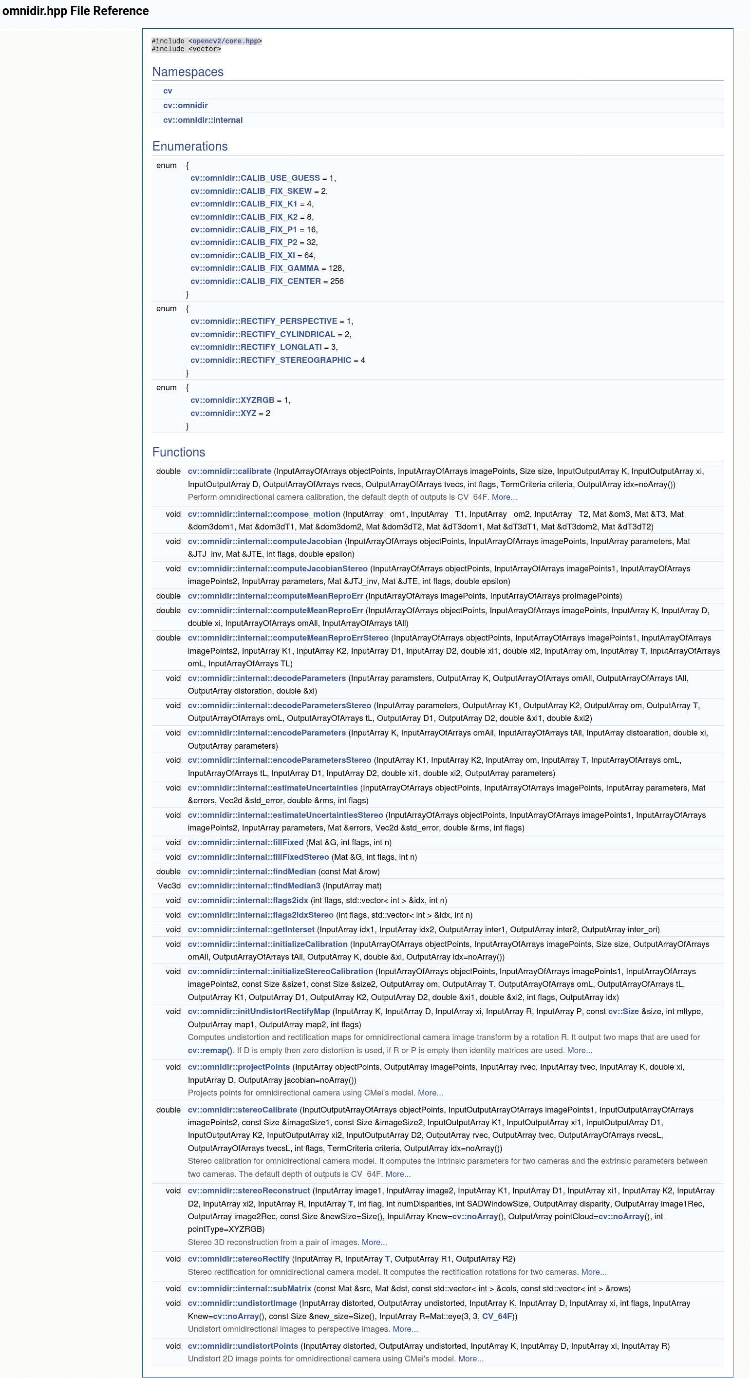 OpenCV:cv: pinhole + Radtan , cv::fisheye: pinhole + Equi , cv::omnidir: Omni + Radtan