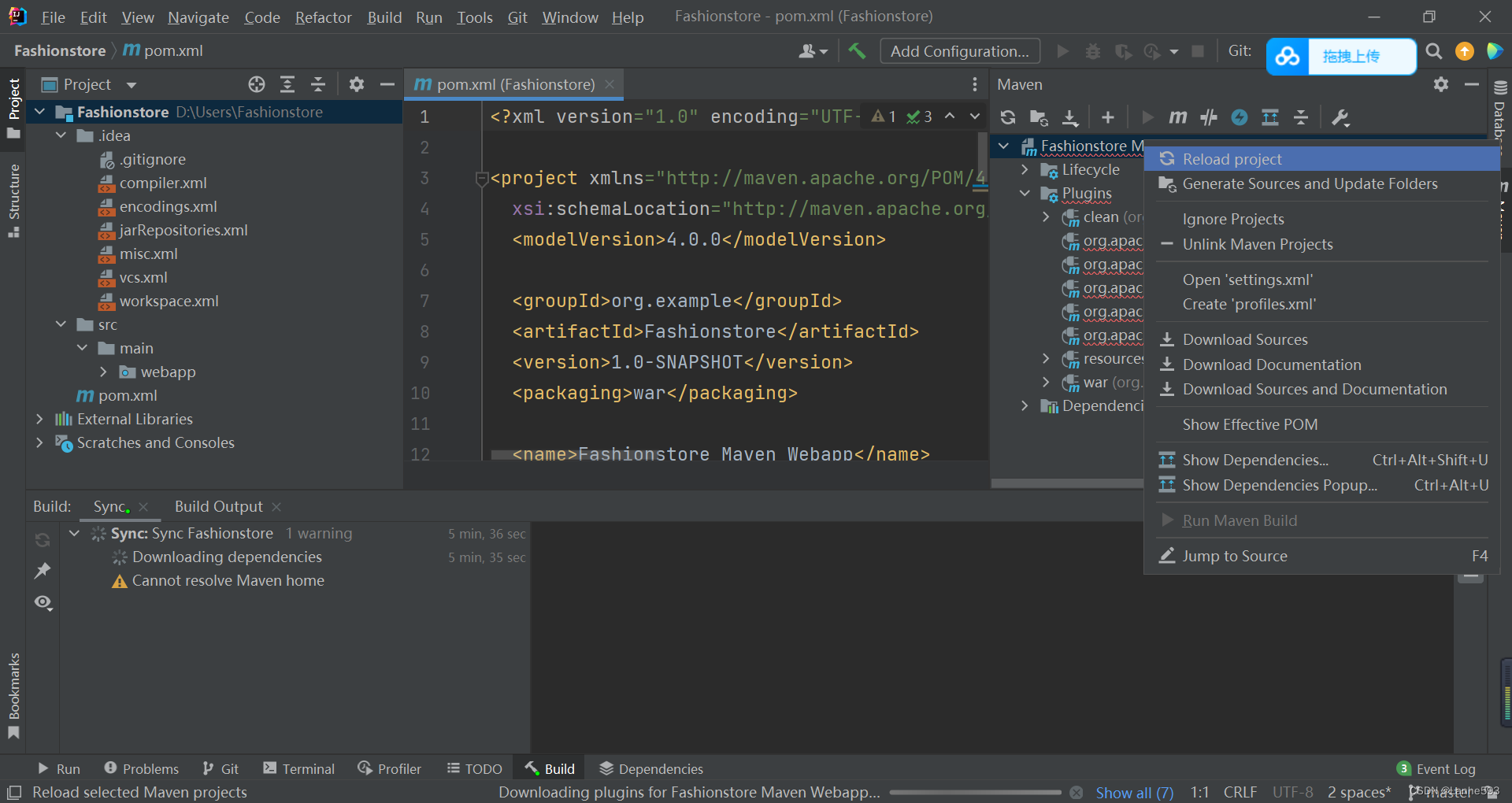 如果右侧plugins爆红,解决方法如下,右击maven,点击reload project