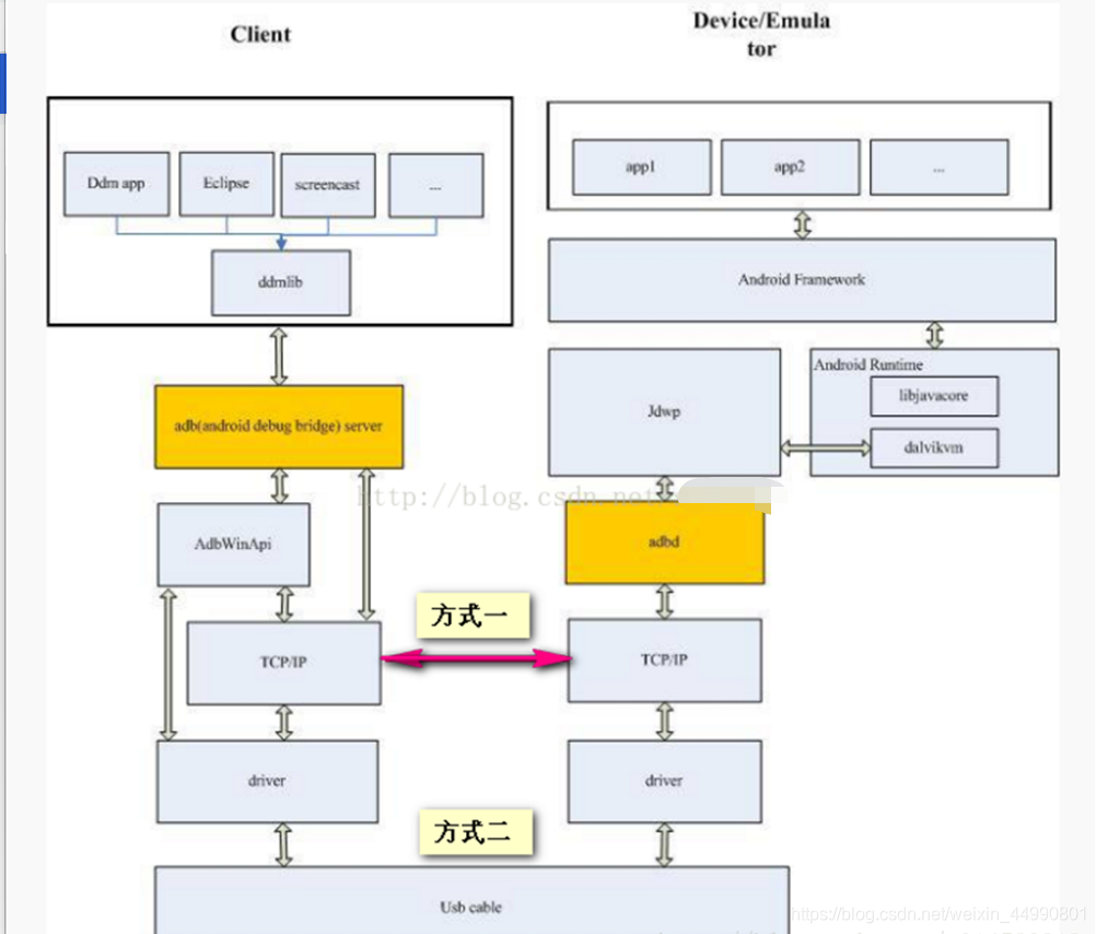 ADB Daemon:运行在手机上的一个进程,作用是连接到adb server(通过usb或tcp-ip),并且为client提供一些服务