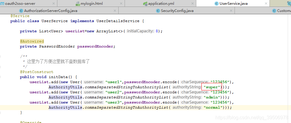 userList.add(new User("user1",passwordEncoder.encode("123456"), AuthorityUtils.commaSeparatedStringToAuthorityList("super")));