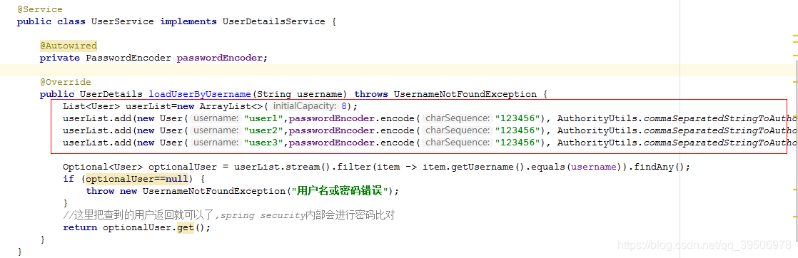 userList.add(new User("user2",passwordEncoder.encode("123456"), AuthorityUtils.commaSeparatedStringToAuthorityList("admin")));