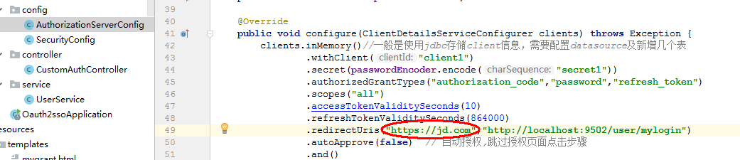 .redirectUris("http://baidu.com","http://localhost:9502/login") // 授权成功后运行跳转的url,sso客户端默认/login,可在client端通过security.oauth2.sso.login-path修改为其它