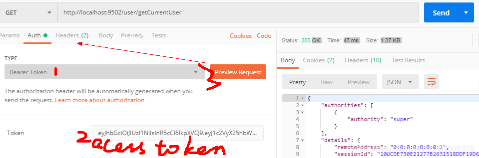 使用access_token访问资源服务器资源,可以使用postman Auth功能,其实就是通过1,2,3步骤添加了一个Authorization请求头,也可以直接http://localhost:9502/user/getCurrentUser?access_token=上面的access_token. 注意@EnableOAuth2Sso不是@EnableResourceServer复合注解,需要通过access_token手动访问资源服务器接口必须启动类加上@EnableResourceServer但是加上后所有的sso客户端所有资源都会被保护,不能直接访问了,需要另外的处理。。。(资源服务器与sso客户端区别??)