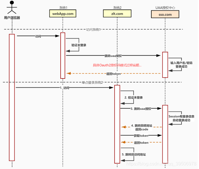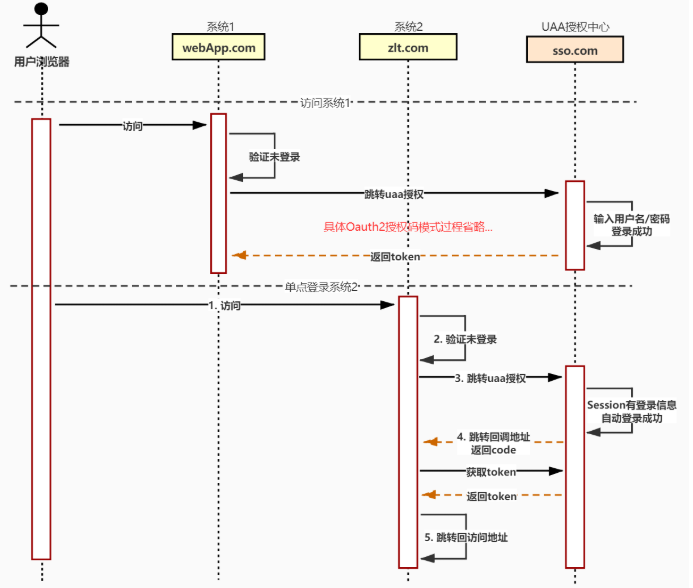 Session中,并在浏览器写入域为sso.com的Cookie - 访问系统2判断未登录,则跳转到UAA系统请求授权