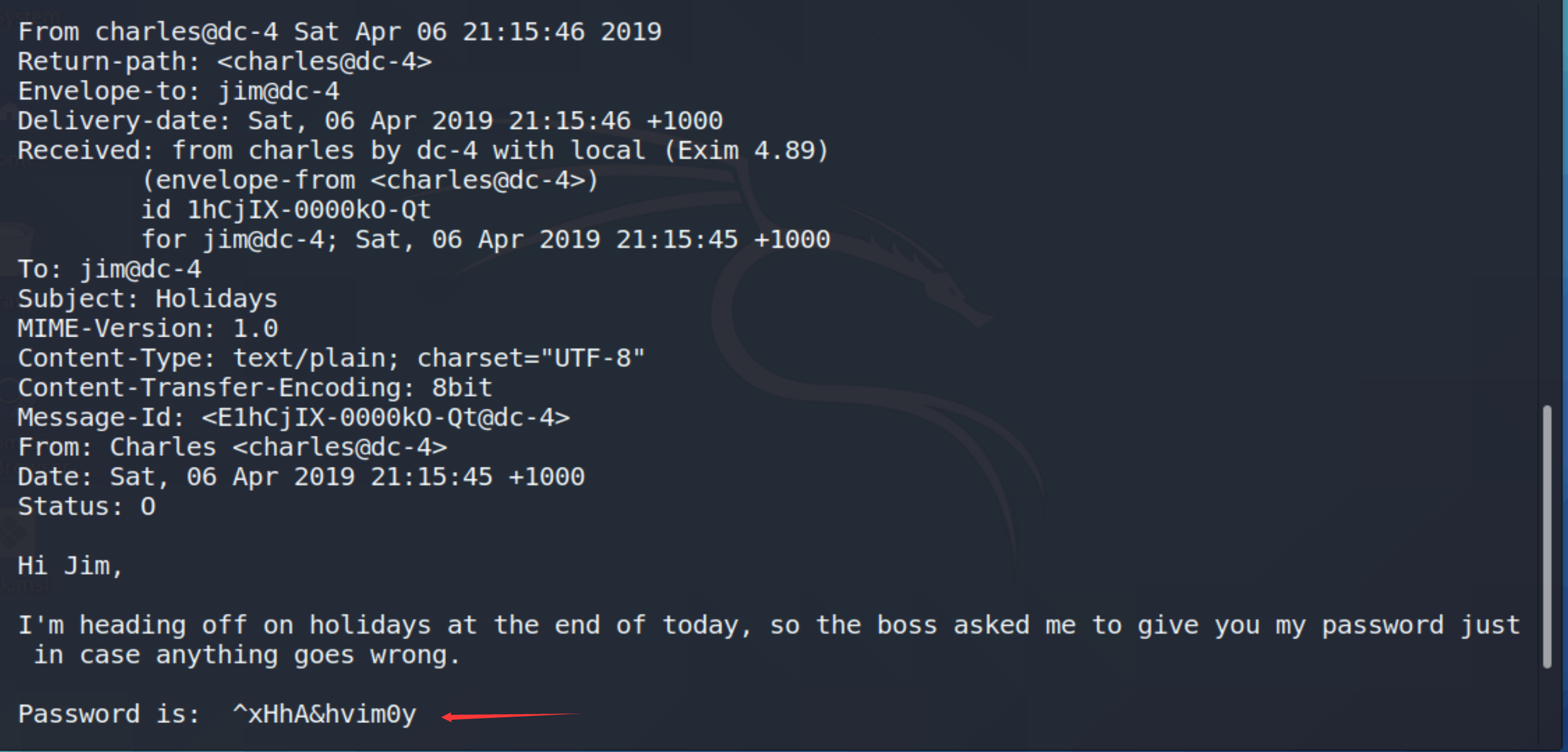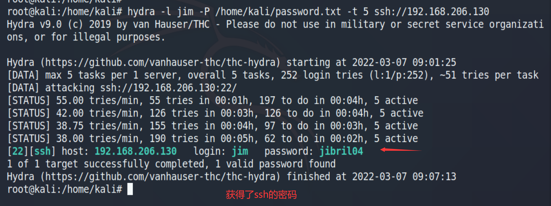 hydra -l jim -P /home/kali/password.txt -t 5 ssh://192.168.206.130